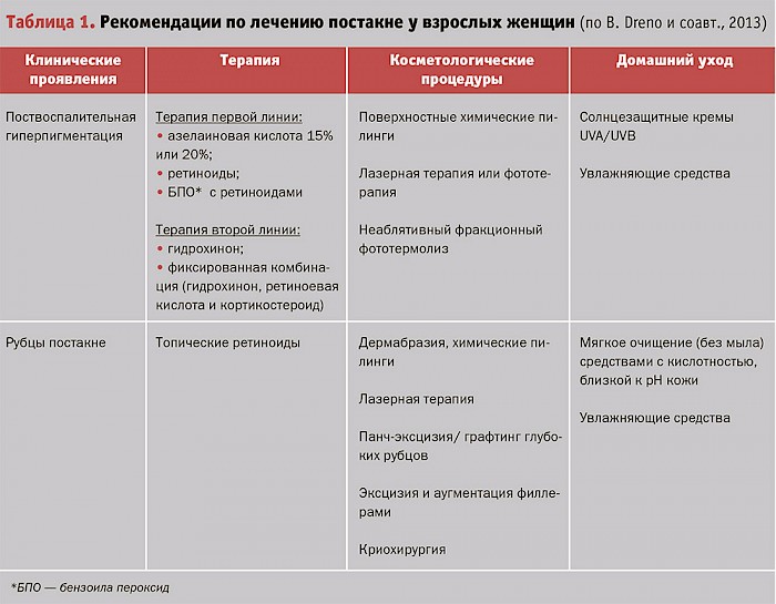Косметологические методы терапии были представлены в Международных рекомендациях по лечению акне и постакне (табл. 1) взрослых женщин 2013 г., согласно которым при одновременном наличии воспалительных акне и признаков рубцевания и/или дисхромий доказанной терапевтической и профилактической эффективностью обладают лишь ТР.