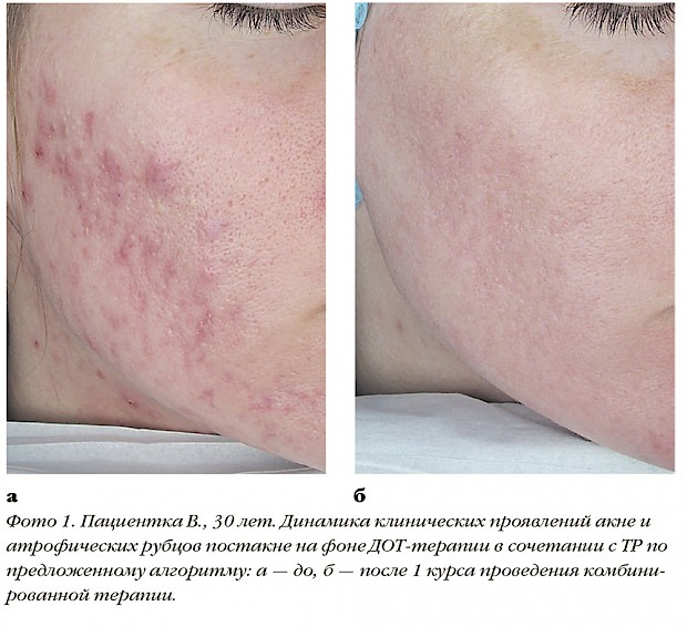 Примечание. Пациентам с атрофическими рубцами постакне I–II уровня поражения и поствоспалительной гиперпигментацией при соблюдении всех рекомендаций в большинстве случаев достаточно 1 курса комбинированного лечения (фармакотерапия + ДОТ-терапия).