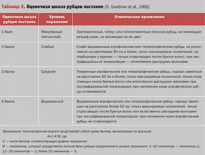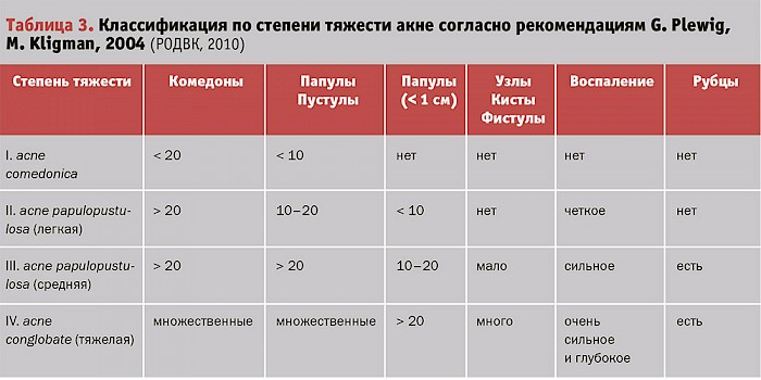 I. На первом осмотре врач оценивает степень выраженности клинических проявлений акне по классификации G. Plewing и M. Kligman (2004) (табл. 3) и атрофических рубцов постакне по классификации G. Goodman и J. Baron (2006). Степень тяжести акне определяется как средняя за счет наличия рубцовых изменений кожи, которые не характерны для более легких форм.