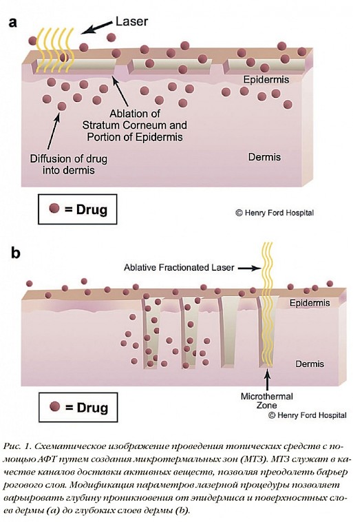 Безусловно, в базовых программах ухода за кожей ведущее место занимает применение топических косметических и космецевтических средств. Однако их биодоступность при этом составляет лишь 1–5%. Более того, даже проникшие в кожу препараты не всегда пенетрируют достаточно глубоко, чтобы достигнуть своей мишени в тканях (L.R. Sklar и соавт., 2014). Основную роль в этом играет эпидермальный барьер — сложная структура, состоящая из многих взаимосвязанных компонентов, главным из которых является роговой слой. Теория эпидермального барьера стала активно развиваться в 90-е годы прошлого века благодаря работам Альберта Клигмана и получила название корнеология. Современная концепция выделяет следующие факторы, влияющие на пенетрацию веществ: липофильность, размер молекулы — не более 3 кДа, отсутствие заряда, характер связывания со структурными компонентами кожи и ряд других. Для доставки многих активных препаратов, не удовлетворяющих данным условиям, прибегают к инъекционным либо системным способам (Е.И. Эрнандес и соавт., 2005). В настоящей статье рассмотрим возможности трансэпидермальной доставки препаратов с помощью аблятивного фракционного фототермолиза (АФТ). Существенное влияние на его внедрение в современную косметологию оказала ДОТ-терапия1 (дермальный оптический термолиз) — метод, который характеризует контролируемое дозированное повреждение эпидермиса и дермы, вызывающее активную регенерацию кожи и, соответственно, приводящее к ее омоложению. Важно, что ДОТ-терапия отличается терапевтической универсальностью — разнообразием показаний к ее применению.