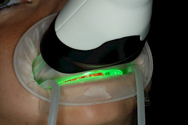 - Уникальная насадка, которая охватывает всю полость рта, позволяет сократить время процедуры до 30 минут.
