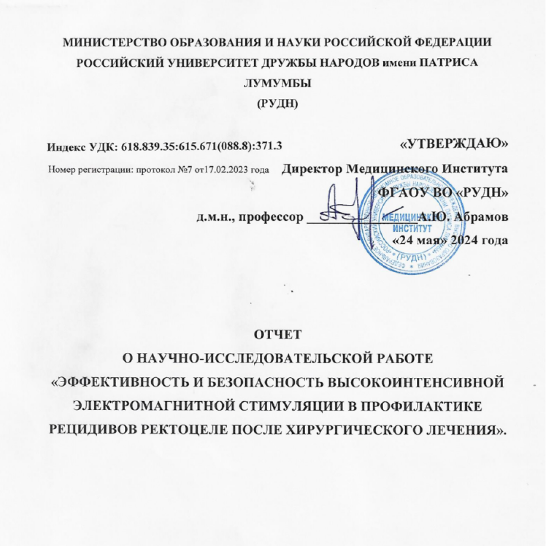 В ходе исследования, проведенного на базе кафедры акушерства и гинекологии с курсом перинатологии медицинского института РУДН, были изучены методы лечения и профилактики рецидивов ректоцеле с учетом механизмов формирования дефектов тазового дна. Исследование было проведено под руководством д.м.н., профессора Оразова Мекана Рахимбердыевича и д.м.н. Силантьевой Елены Сергеевны.
