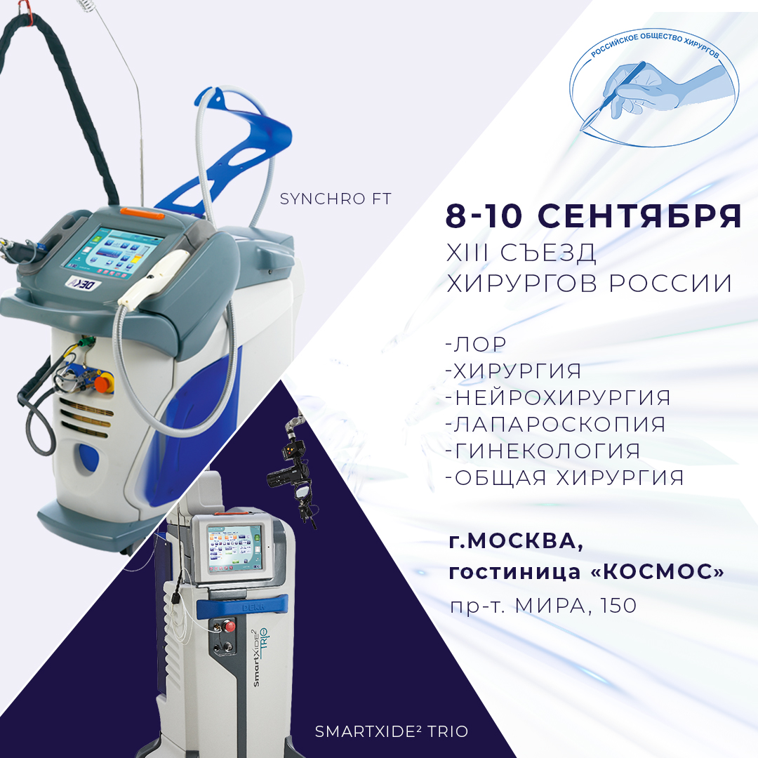 От нас будут представлены аппараты SmartXide 2 Trio и Synchro FT, которые позволяют осуществлять различные процедуры в области хирургии, лор-хирургии, нейрохирургии, гинекологии и общей хирургии.