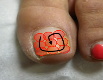 Лечение было проведено с использованием Nd:YAG лазера длиной волны 1064 нм (Synchro REPLA:Y, DEKA, Италия). Пациенты не проходили специальное лечение до проведения исследования. От всех пациентов было получено письменное информированное согласие. Протокол воздействия (плотность — 30 Дж/см2, продолжительность импульса — 5 мсек и пятно – 5 мм) облучалась вся ногтевая пластина, начиная от кутикулы, посредством постепенного перемещения луча по спирали без каких-либо смещений, как показано на рисунке ниже: