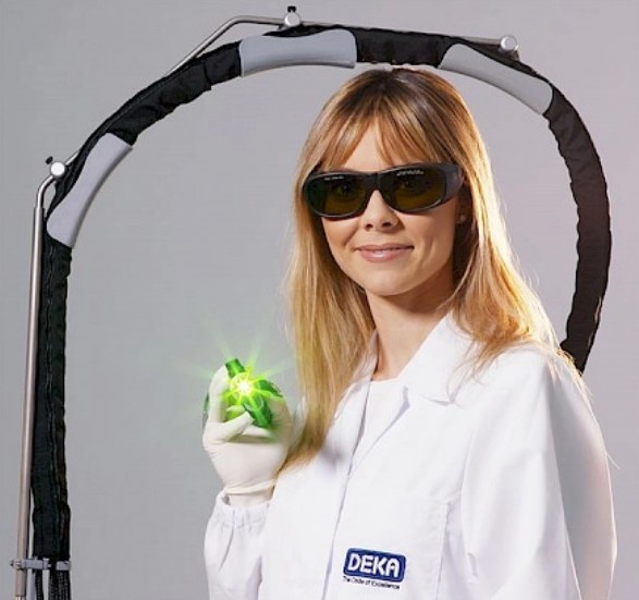 Такой метод является очень быстрым, но может быть болезненным и не лишенным возможности создания побочных эффектов, в частности, если конкуренция между меланином, содержащимся в волосах, и содержащимся в коже не является существенной, что характерно для более темных фототипов кожи. Компания ДЕКА, теперь предлагает, для проведения эпиляции, новую манипулу с технологией Moveo (см. рисунок ), которая решает два, вышеописанных вопроса. Рисунок показывает, что манипула Moveo имеет встроенную контактную систему охлаждения кожи. Сапфировый наконечник охлаждается до 15°С для обеспечения максимального комфорта пациента.