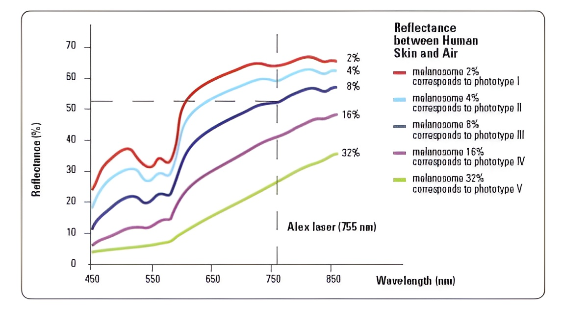 Известный факт, — преимущественный хромофор для александритового излучения, -меланин, который содержится в меланосомах, меланоцитах. График, представленный на рисунке ниже, демонстрирует коэффициент отражения кожи, в ответ на воздействие излучения лазера при разном содержания меланина. При длине волны 755 нм (длина волны александритового лазера) и содержании меланина на уровне 8% (согласно фототипу III) процент отражения составляет больше 50%. Это означает, что значительная часть энергии теряется в ходе выполнения процедуры и, следовательно, не может использоваться для терапевтических целей. Такая потеря вызвана высокой изменчивостью между коэффициентом отражения кожи и воздуха, который располагается сверху (рисунок показывает смоделированный коэффициент отражения кожи по различным уровням содержания меланосом).