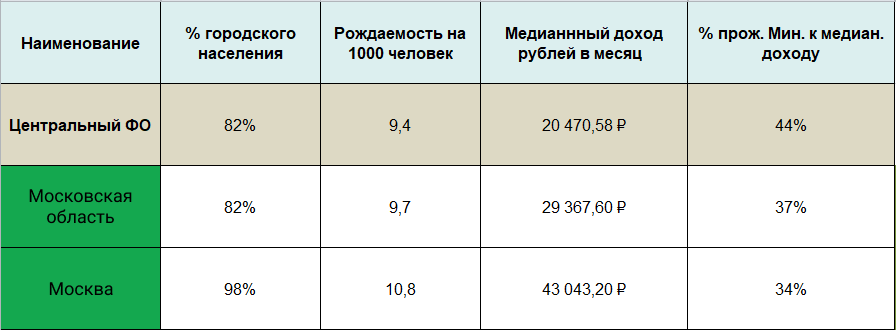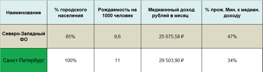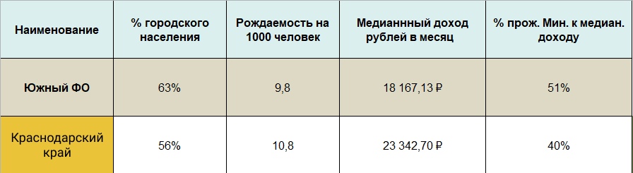После оценки каждого региона по каждому из показателей мы отобрали те, в которых 3 или 4 значения были выше среднего по Федеральному округу.