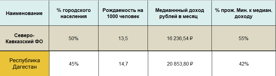 Это показатель позволяет нам понять, какой процент дохода в месяц уходит на удовлетворения минимальных потребностей. Чем выше значения показателя, тем меньше человек может потратить на дополнительные потребности или сберечь. Большая часть доступных на аппарате лазерных процедур, так или иначе, не являются базовыми потребностями человека, поэтому мы считаем данный показатель хорошим дополнением для понимания платежеспособности населения в регионах. За основу для сравнения было взято среднее значение % прожиточного минимума к медианному доходу каждого Федерального округа России. Регионы, процент прожиточного минимума к медианному доходу которых ниже среднего значения своего Федерального округа, мы считаем перспективными.