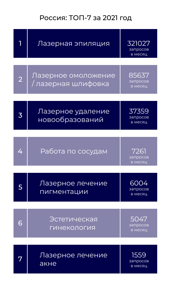 Первое место ожидаемо занимает лазерная эпиляция, спрос на нее постоянно растет уже в течение многих лет. В 2021 году количество запросов увеличилось почти на 50% относительно 2020 года. В 2022 году мы ожидаем схожий рост количества запросов, особенно если будет улучшаться эпидемиологическая ситуация в стране.