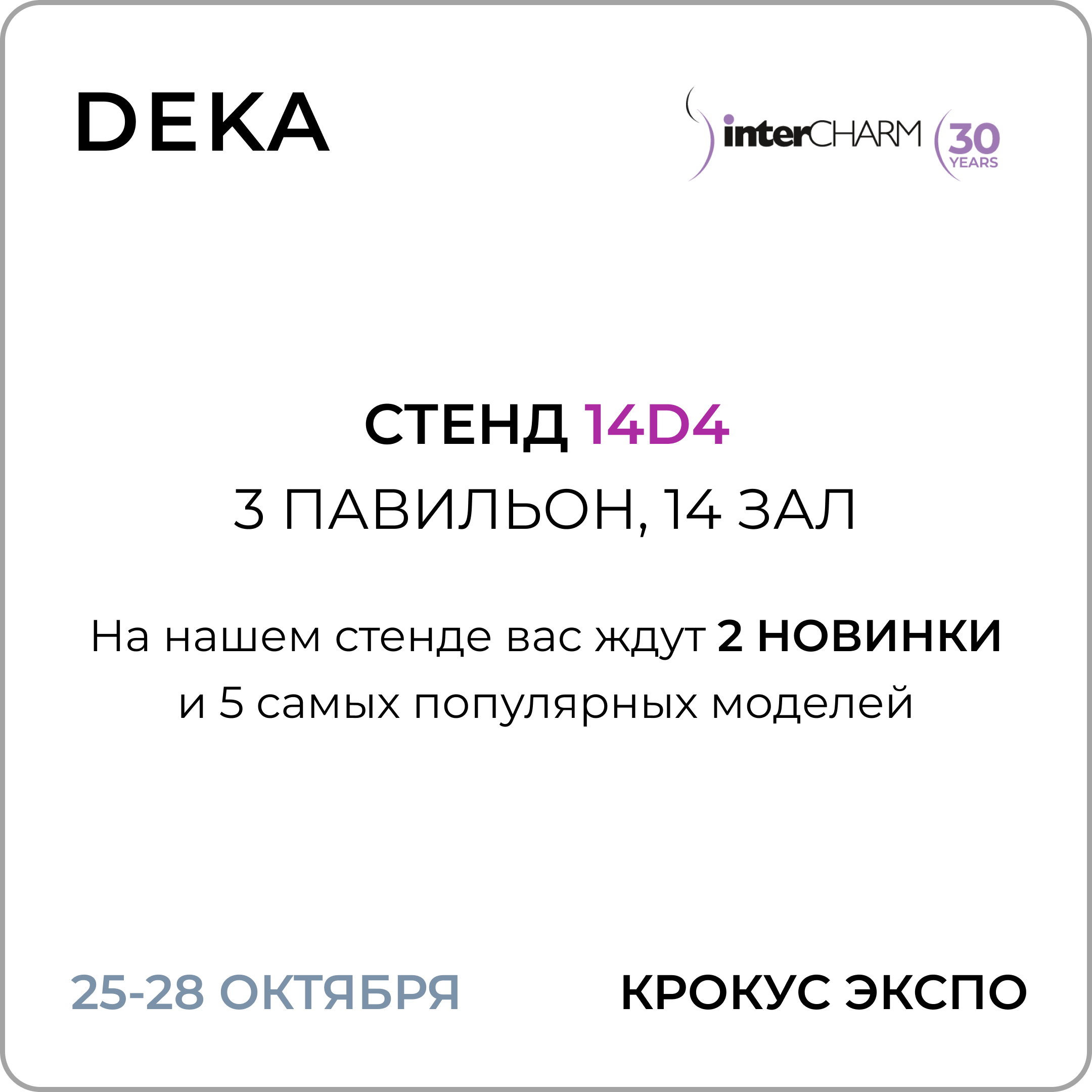 С 25 по 28 октября в Крокус Экспо, г. Москва. Стенд DEKA — 14D4, 3 павильон, 14 зал. На нашем стенде вас ждут 2 НОВИНКИ и 5 самых популярных моделей.